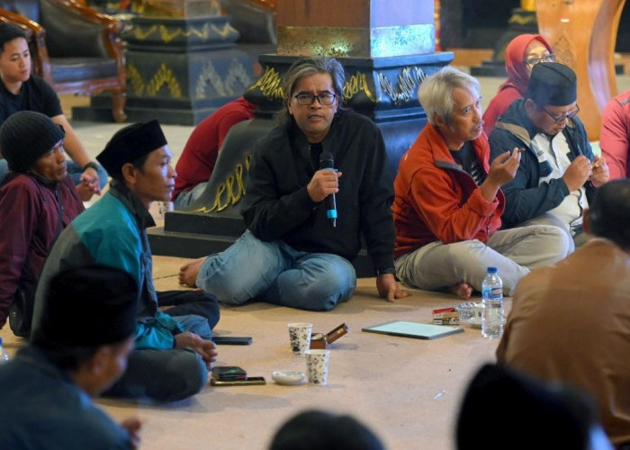Ia duduk bersahaja bersama warga dan para sesepuh desa, mengenakan iket kepala serupa.